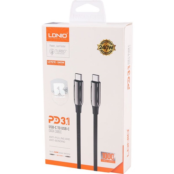 کابل 2 سر تایپ سی الدینیو LC921C ، یکی از جدیدترین تولیدات کمپانی LDNIO است که بی شک ، یکی از قدرتمندترین کابل های موجود در سراسر دنیاست.درنگاه اول ، سری های فلزی براق بلند با محافظ سوکت و کانکتور و روکش کنفی ضخیم ، کاملا خود نمایی می کند و به وضوح گویای کیفیت ساخت بی نظیر این محصول است!این محصول ، دارای خروجی 240 وات با 5.0 آمپر شدت جریان است وبه همین دلیل بی تردید ، جزو قوی ترین کابل هاست مه نشان از کیفیت بالای رشته های درونی و متریال به کار رفته در این کالاست.با توجه به روکش کنفی ضخیم این محصول دارای استاندارد ANTI-PULLING ( مقاوم به کشیدگی ) و ANTI-BENDING ( مقاوم به پیچش و خمش ) شده است.علاوه بر این با توجه به تکنولوژی های به روز استفاده شده در کابل دوسرتایپ سی 240 وات الدینیو LC921C ، این محصول ، تمامی استانداردهای روز دنیا را داراست.کابل های PD می توانند بصورت هوشمند ، وات و شدت جریانی دستگاهی که به آن متصل می شوند را تشخیص دهد و متناسب با آن ، خروجی خود را تنظیم کند. ازین رو این محصول ، برای شارژ طیف گسترده ای از انواع دستگاه ها از تمامی برندها ، ایده آل و کارآمد است.